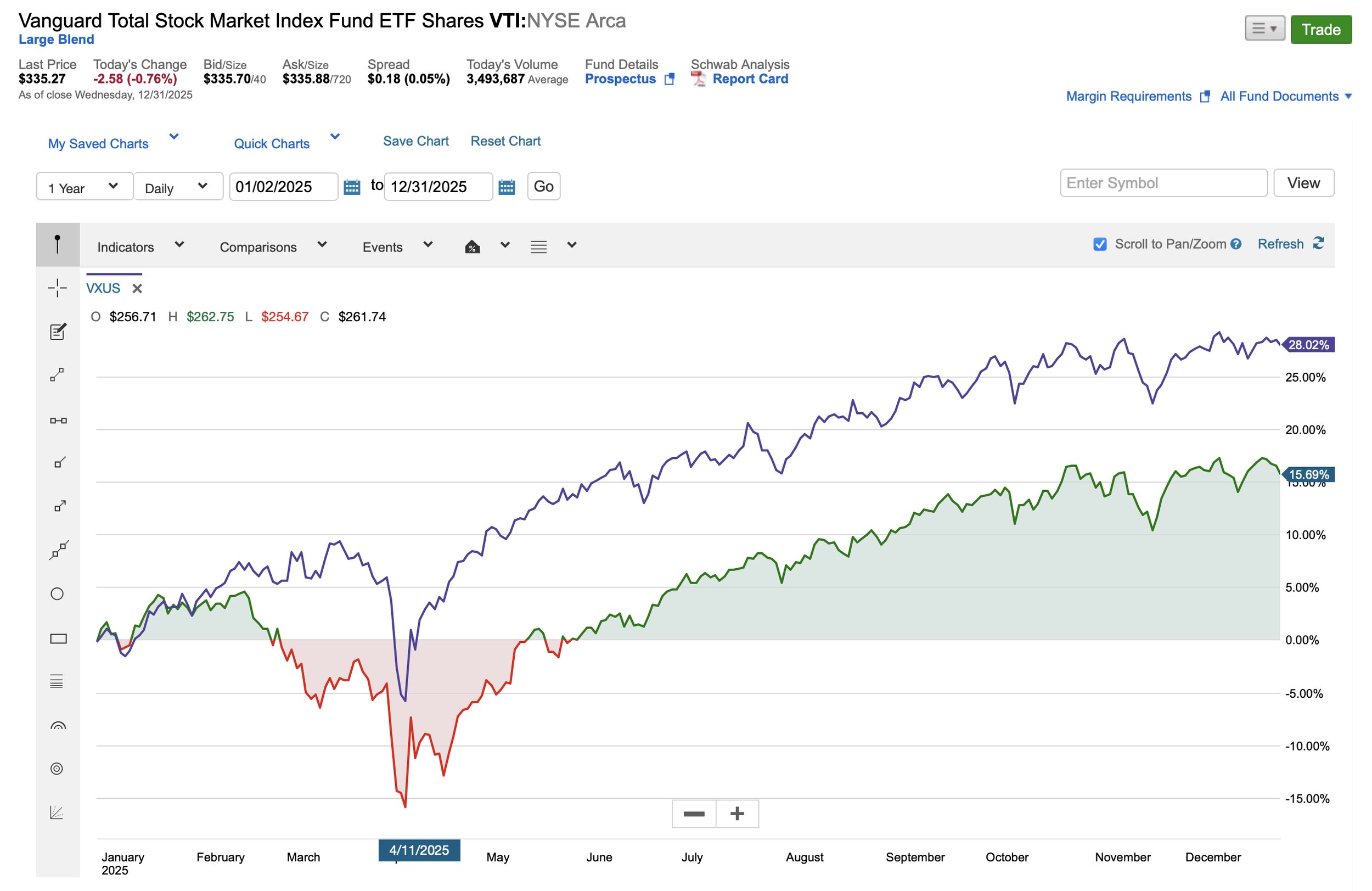 However, International (VXUS) crushed 2025 with a 28% gain, reversing years of underperforming vs the U.S.
